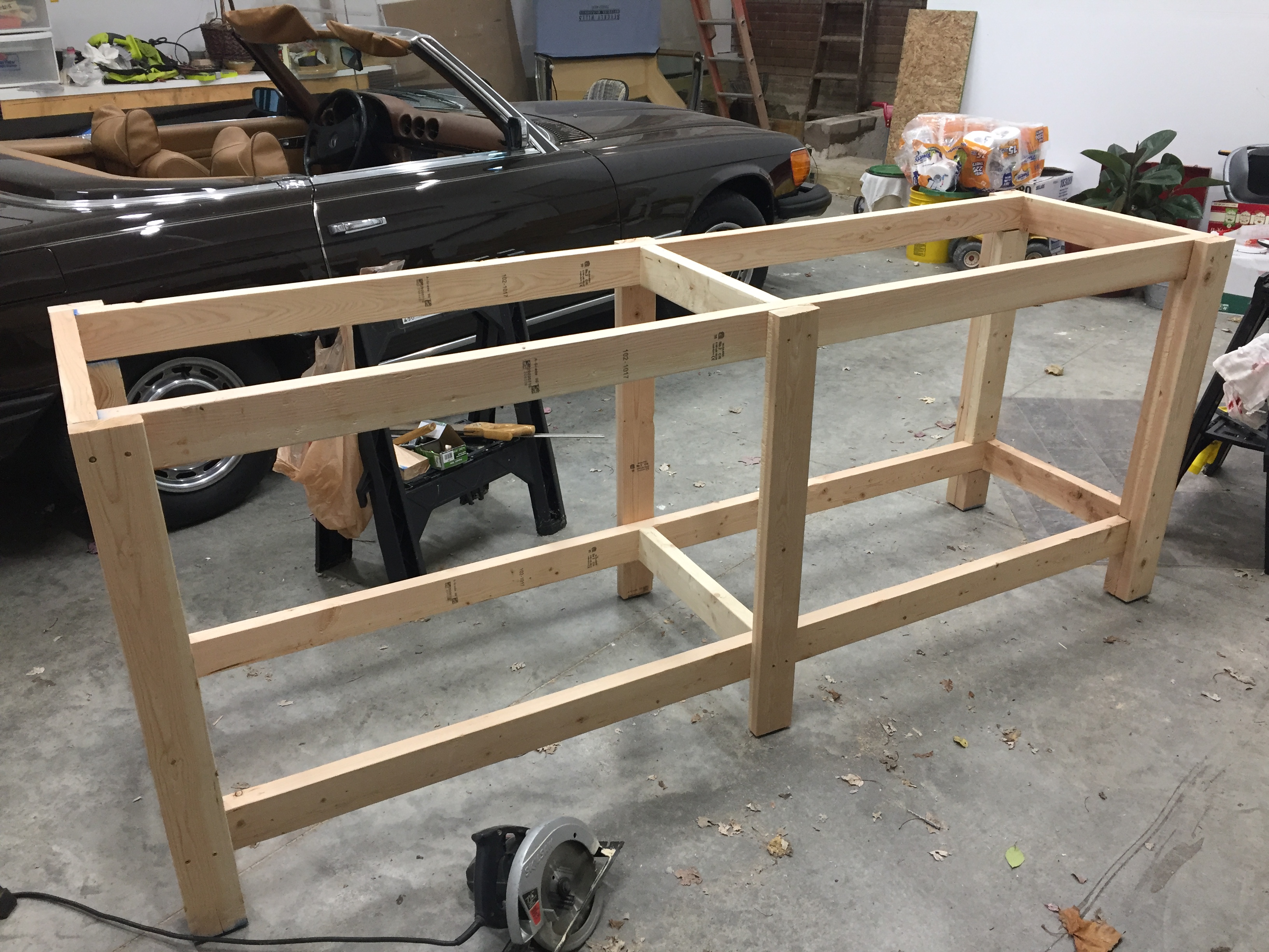 First we needed to move the dining tables and chairs and other unnecessary items into storage. Next, I built a sturdy wooden base for an an 8-foot-long butcher block work tabletop that had been in storage and which I thought would make a perfect sales counter.