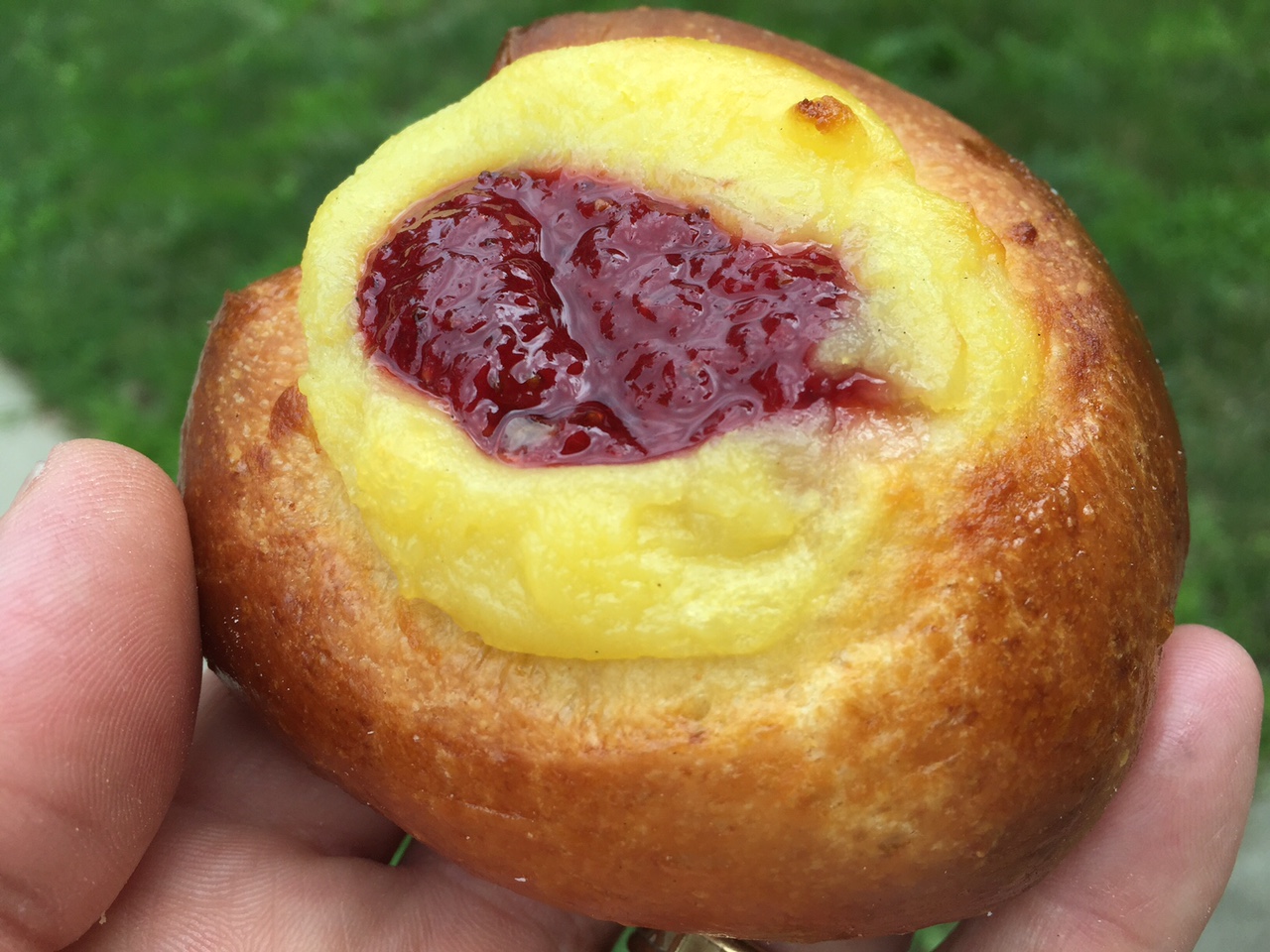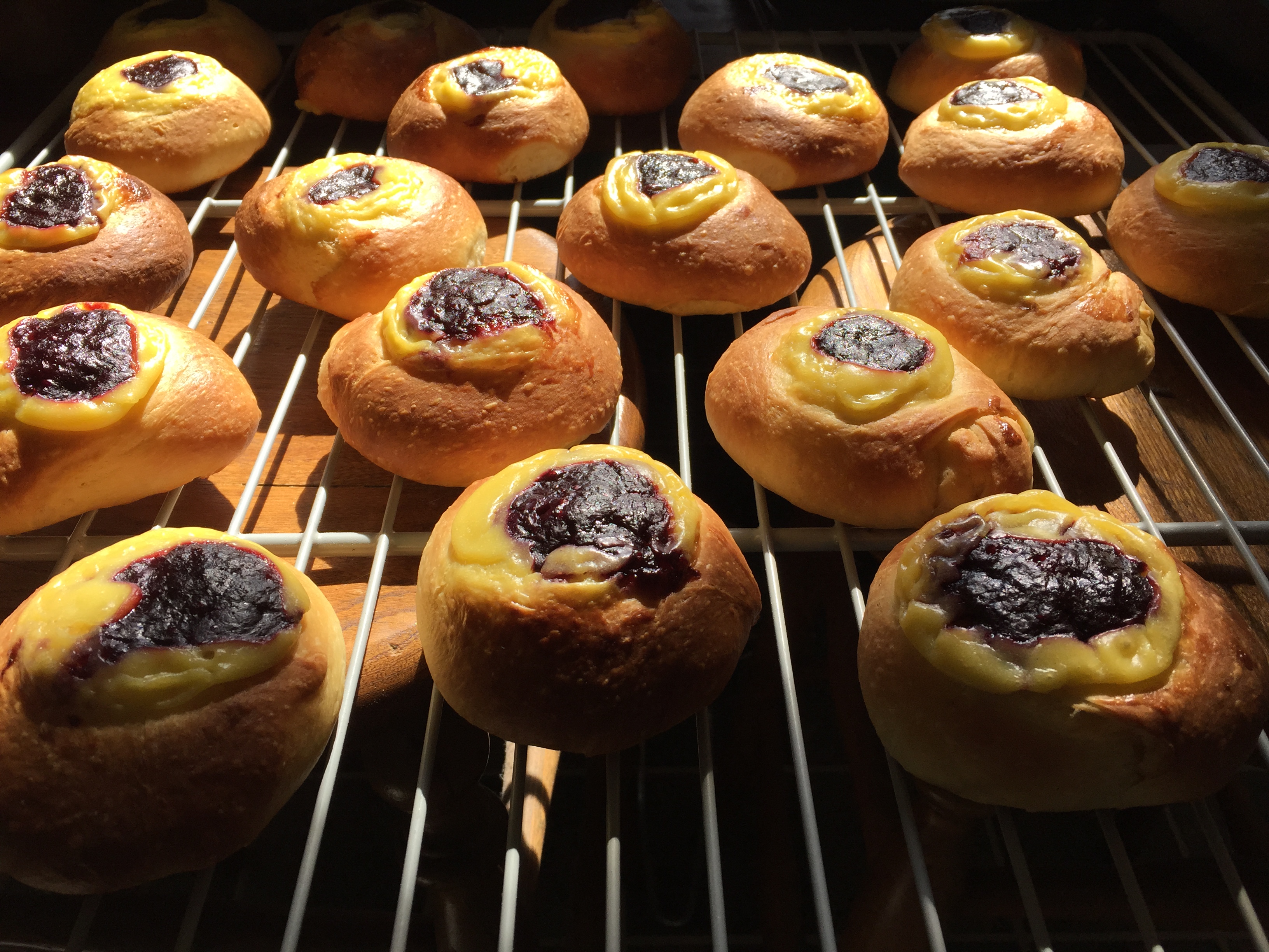 10:15 — Last three (of 12) baguettes into oven. Fill 20 brioch pastries with blackberry preserve and pastry creme. Place in 390 F range oven. (damn, forgot the egg wash. But didn’t really have time anyway. Oh well, next week..)