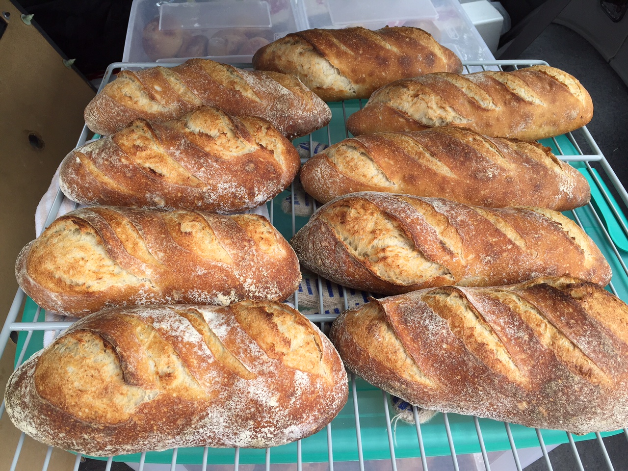 All the rolls, loaves and pastries came out fine, and when the market was done all but five loaves of bread (out of 57 loaves) plus five bags of rolls and 16 pastries were gone. I was pooped, but it was a worthwhile and remunerative market week.