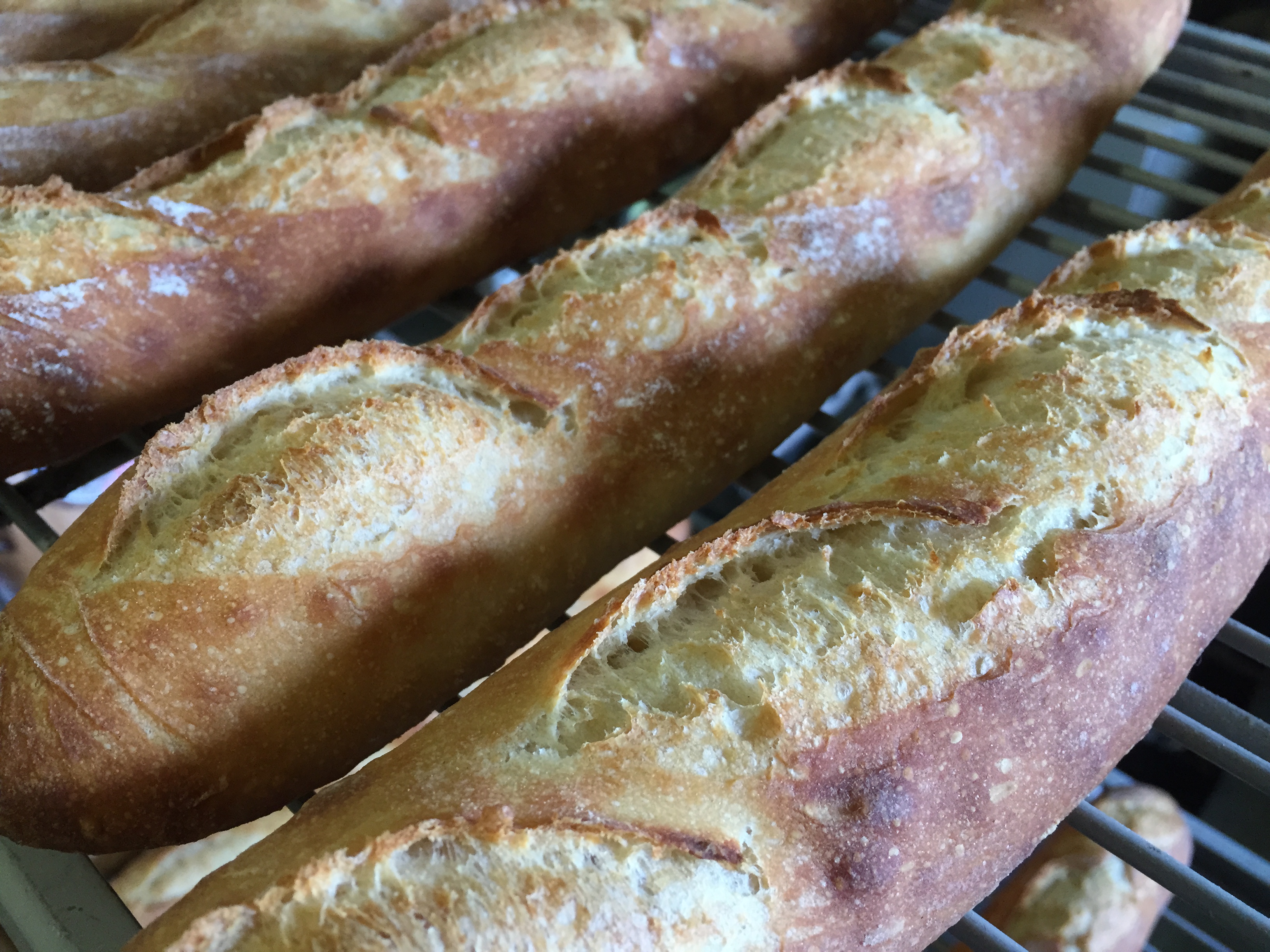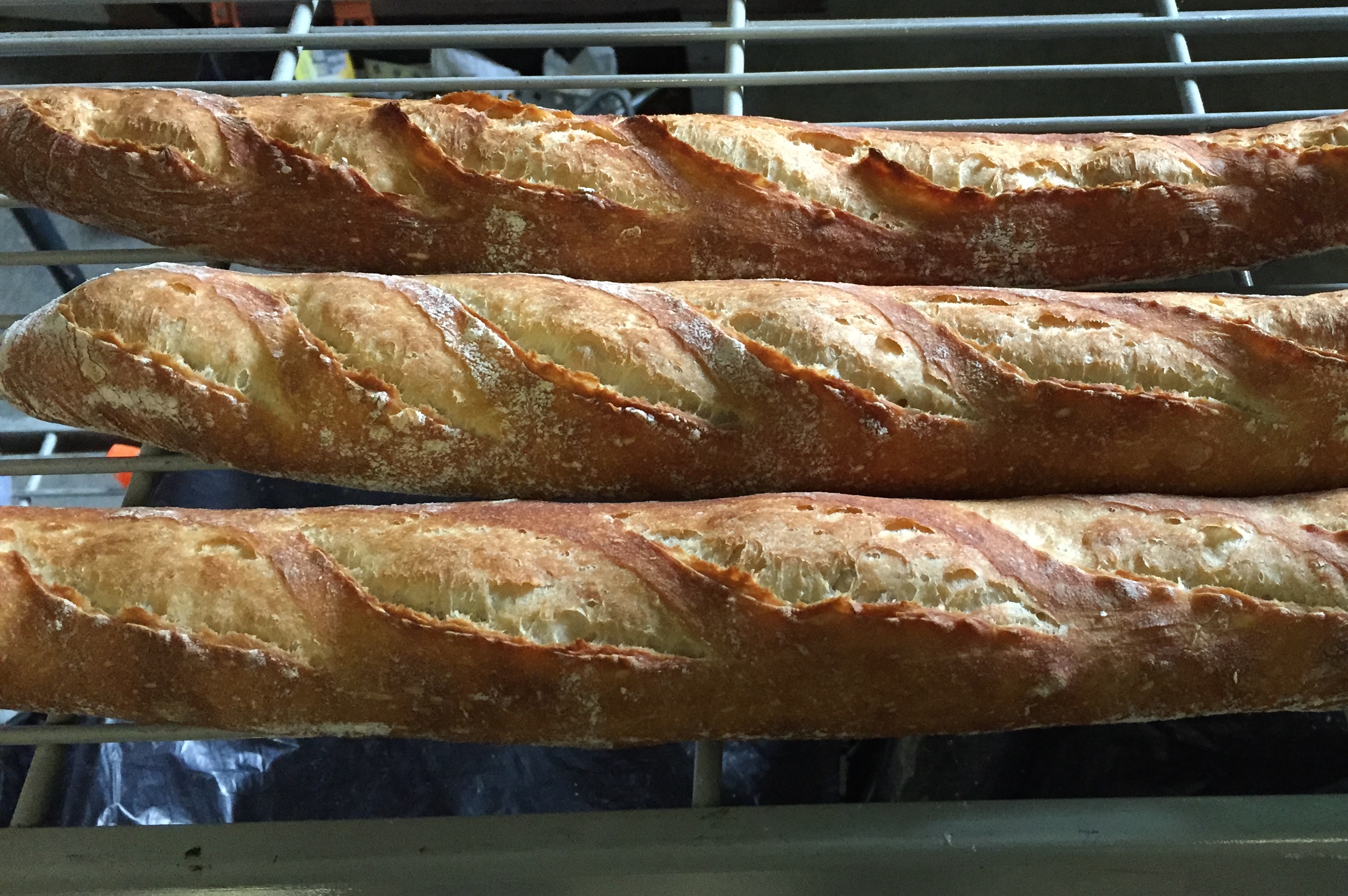 8:45 — First baguettes into steamed range oven.